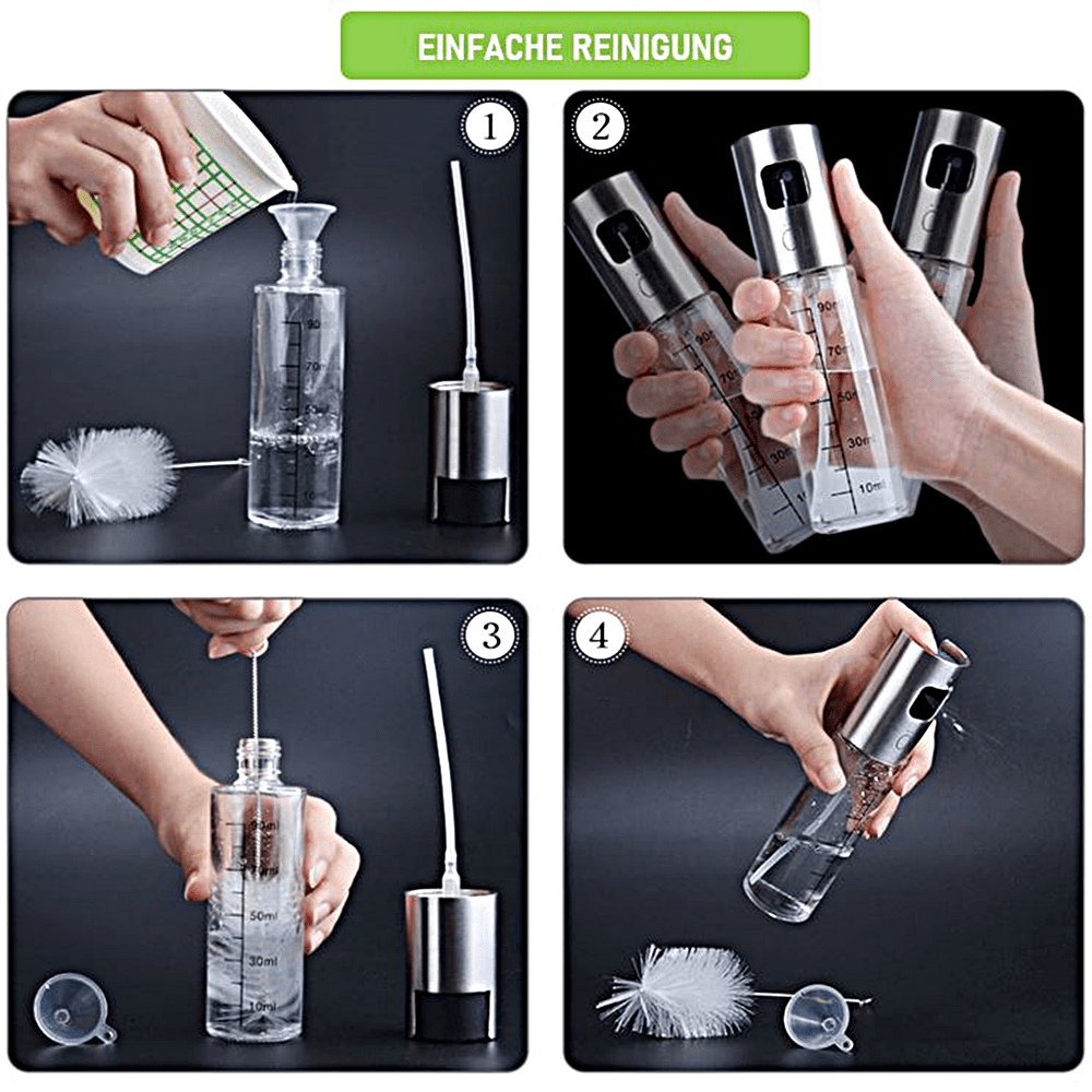 - SIMPLE REINIGUNG: Der mitgelieferte Trichter erleichtert das Befüllen und schützt effektiv vor Verstopfungen der Öl Sprayflasche. Mit Hilfe der enthaltenen Reinigungsbürste kann der Ölsprayer leicht und schnell gereinigt werden.